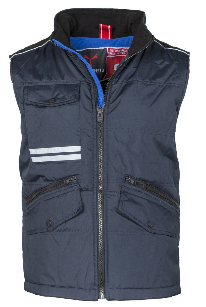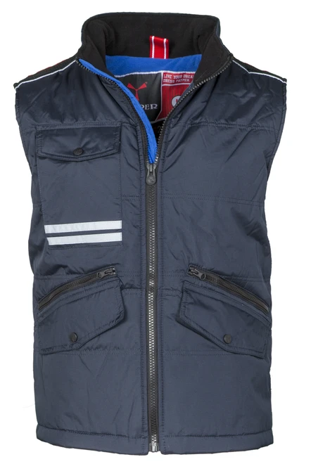 Taillierte Herren-Weste mit Reißverschluss, zwei Außentaschen mit LOCK SYSTEM und zwei mit Reißverschluss, schräg stehenden Taschen, um das Einführen der Hand zu erleichtern, einer Handy-Brusttasche und einem Ring zum Befestigen des Ausweises, Reflexstreifen auf der Tasche und auf dem Rücken; Innenseite: wattiert, Fleece in Kontrastfarbe auf Rücken und Kragen, Innenreißverschluss zum einfacheren Veredeln mit Druck und Stick