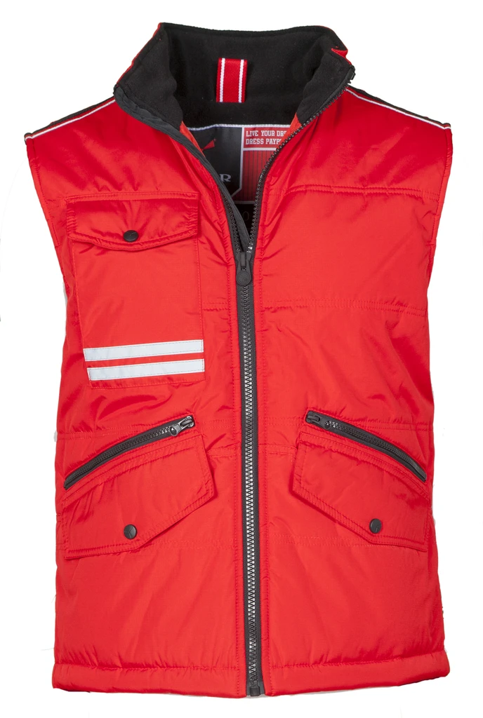 Taillierte Herren-Weste mit Reißverschluss, zwei Außentaschen mit LOCK SYSTEM und zwei mit Reißverschluss, schräg stehenden Taschen, um das Einführen der Hand zu erleichtern, einer Handy-Brusttasche und einem Ring zum Befestigen des Ausweises, Reflexstreifen auf der Tasche und auf dem Rücken; Innenseite: wattiert, Fleece in Kontrastfarbe auf Rücken und Kragen, Innenreißverschluss zum einfacheren Veredeln mit Druck und Stick