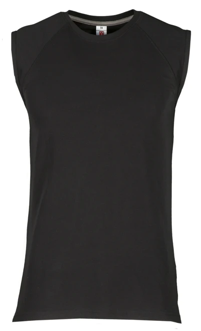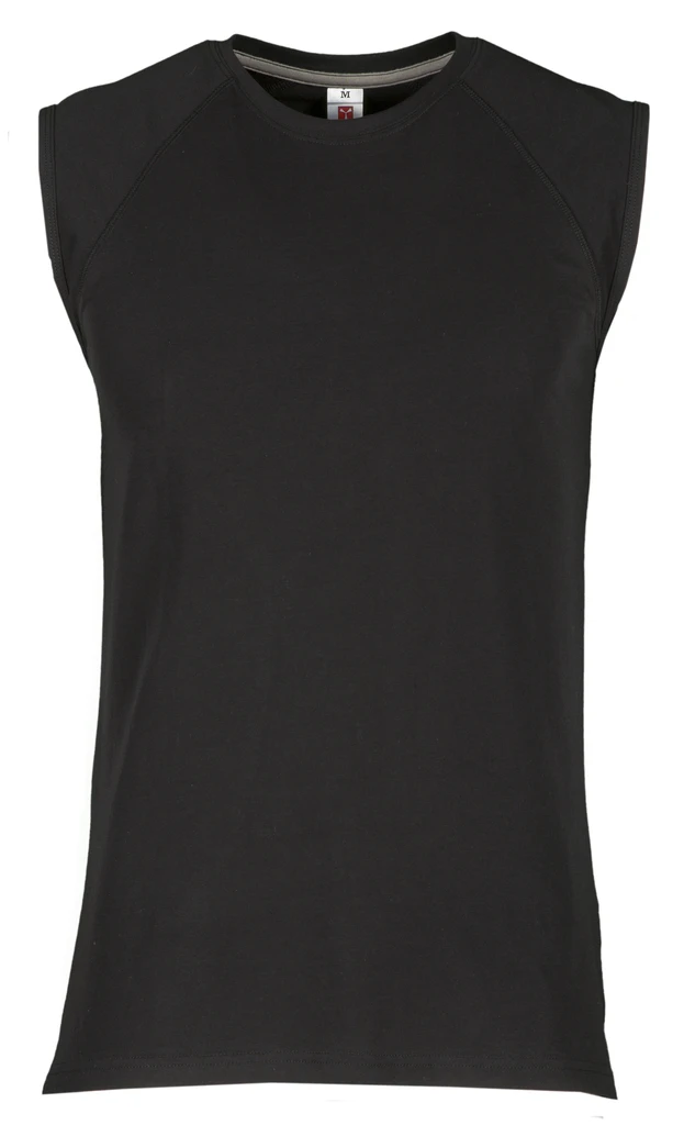 Ärmelloses Herren-Shirt mit Rundhalsausschnitt, Raglanschnitt, Feinripp-Kragen 1,5 cm aus Spandex-Mischgewebe mit Kappnaht an der Vorderseite, Verstärkungsband in Kontrastfarbe von