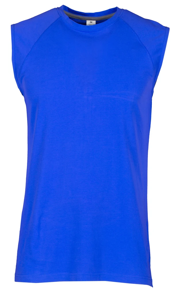 Ärmelloses Herren-Shirt mit Rundhalsausschnitt, Raglanschnitt, Feinripp-Kragen 1,5 cm aus Spandex-Mischgewebe mit Kappnaht an der Vorderseite, Verstärkungsband in Kontrastfarbe von