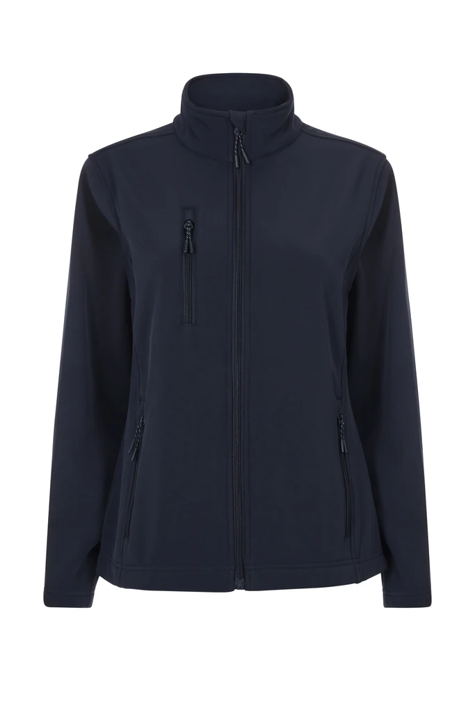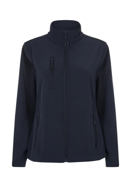 Softshelljacke für Damen. 94 % Polyester – 6 % Elasthan. 280 g/m². Wasserabweisend. Weiches und warmes Polarfleece-Futter. Durchgehender Reißverschluss vorne mit Kinnschutz. 3 x Reißverschlusstaschen. Ton-in-Ton-Reißverschluss mit Kunststoffspitze und Polyesterschieber. Hinten länger abgerundet als vorne. Aufhängeöse an der Innenseite des Kragens.