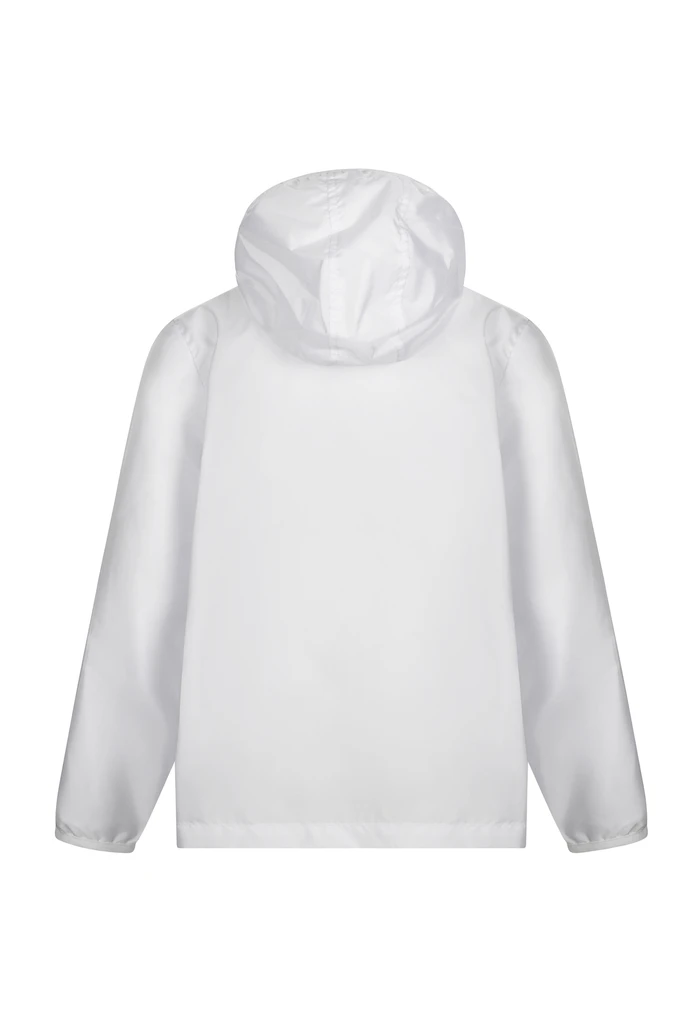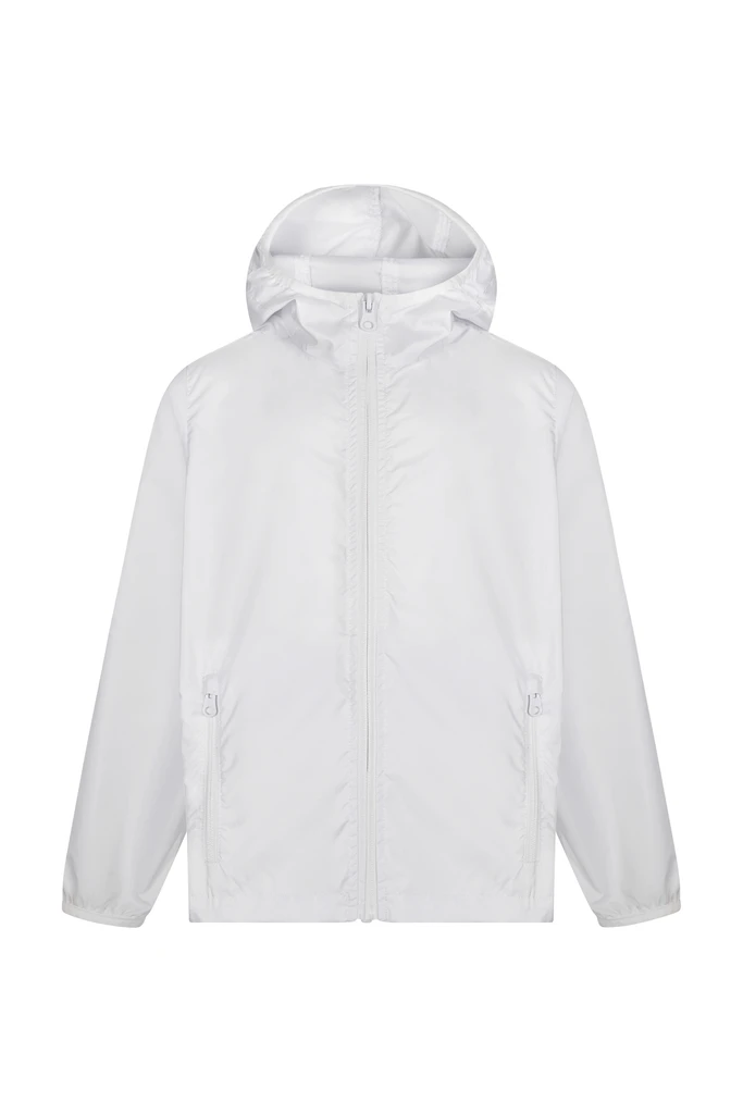 Windjacke für Kinder. Taft. 100% Polyester. 70 g/m². Wasserabweisend. Lässt sich in die linke Tasche falten. Durchgehender Reißverschluss vorne. 2x Seitentasche mit umgekehrtem Reißverschluss mit Schieber. Ton-in-Ton elastische Bündchen und Kapuzenkontur. Gefütterter Boden.