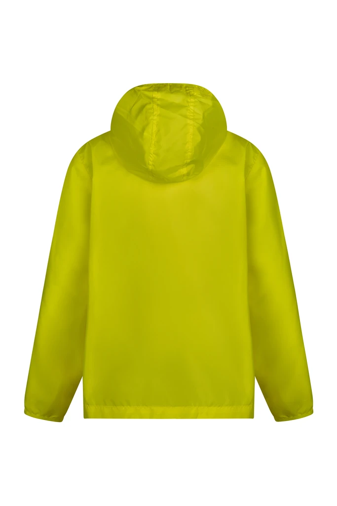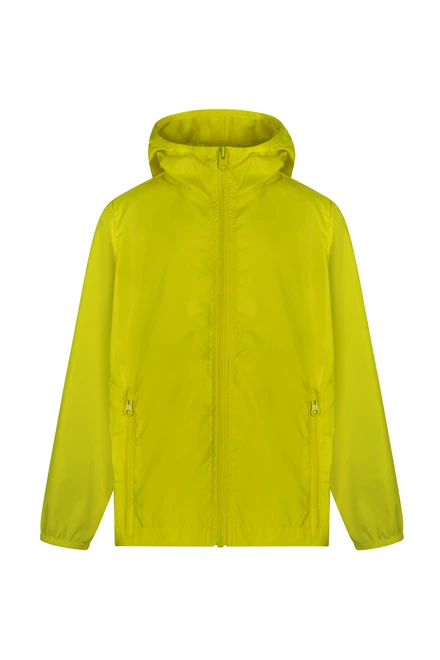Windjacke für Kinder. Taft. 100% Polyester. 70 g/m². Wasserabweisend. Lässt sich in die linke Tasche falten. Durchgehender Reißverschluss vorne. 2x Seitentasche mit umgekehrtem Reißverschluss mit Schieber. Ton-in-Ton elastische Bündchen und Kapuzenkontur. Gefütterter Boden.