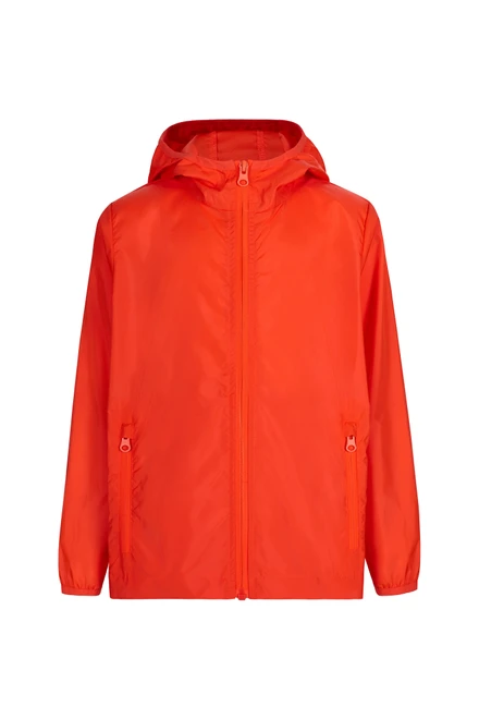 Windjacke für Kinder. Taft. 100% Polyester. 70 g/m². Wasserabweisend. Lässt sich in die linke Tasche falten. Durchgehender Reißverschluss vorne. 2x Seitentasche mit umgekehrtem Reißverschluss mit Schieber. Ton-in-Ton elastische Bündchen und Kapuzenkontur. Gefütterter Boden.
