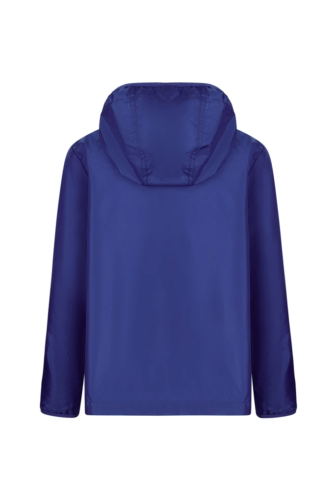 Windjacke für Kinder. Taft. 100% Polyester. 70 g/m². Wasserabweisend. Lässt sich in die linke Tasche falten. Durchgehender Reißverschluss vorne. 2x Seitentasche mit umgekehrtem Reißverschluss mit Schieber. Ton-in-Ton elastische Bündchen und Kapuzenkontur. Gefütterter Boden.