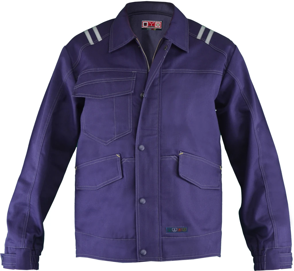 Jacke im Jeans-Design aus Baumwolle, antistatisch, säurebeständig, feuerhemmend, beständig gegen Lichtbogen und für Schweißer geeignet, Doppelnähte in Kontrastfarbe mit Verstärkung an den Ärmeln, an der Seite und hinten. 2 große Taschen in der Taille und 1 kleine Brusttasche rechts mit Stifthalter, alle mit Patte und Klettverschluss. Zur besseren Abdeckung hinten abgerundet und Weitenregulierung mit Klettverschluss, Kugelärmel mit elastischem Bündchen und Knebelverschluss mit Klettband zur Weitenregulierung. Verdeckter Reißverschluss mit Druckknöpfen. 3M-Reflexstreifen auf den Schultern und am unteren Rand hinten, abnehmbares Ausweisfach aus Kunststoff