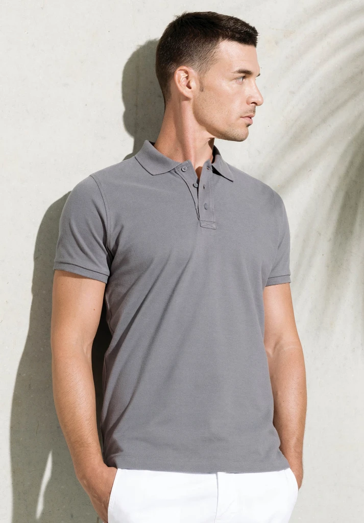 100 % BIO-Baumwolle mit OCS100-Zertifikat - Organic Content Standard (Wine Heather, Ocean Blue Heather und French Navy Heather: 80 % BIO-Baumwolle / 20 % Polyester OCS Blended . Heather Grey: 70 % BIO-Baumwolle / 30 % Viskose OCS Blended). Kragen und Ärmelbündchen in Feinripp 1x1. Knopfleiste mit 3 Ton-in-Ton-Knöpfen. Fischgrätnackenband und Seitenschlitze. Kein Markenetikett am Kragen, nur Größenkennzeichnung für eine leichtere Veredelung.