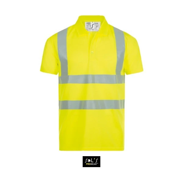 QUALITÄT: 150 MESH - 100% Polyester; ISO 20471 Class I zertifiziert; Kurzarm-Poloshirt - Kragen aus Feinripp 1x1 - Knopfleiste mit 3 Knöpfen - je zwei reflektierende Längs- und Querstreifen