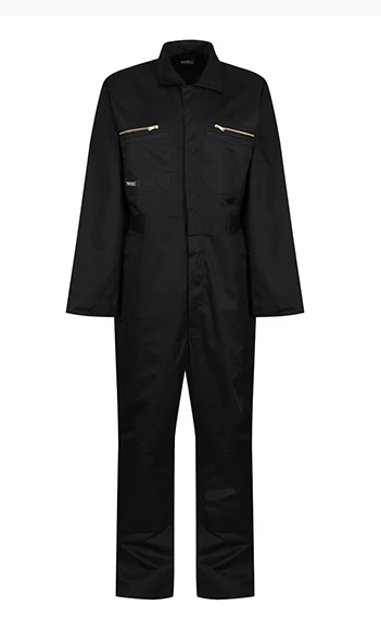 Kragen mit Nieten, verdeckter durchgehender RV, 2 aufgesetzte Brusttaschen mit RV, 1 Oberarmtasche mit RV, teilelastischer Bund, verstärkte Schrittnaht, 2 seitliche Tascheneingriffe, 2 Gesäßtaschen, Kniepolstertaschen, seitliche Zollstocktasche
