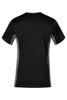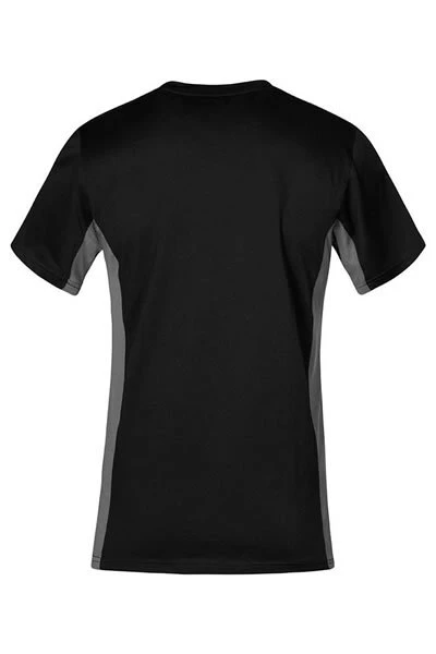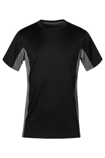 Das funktionelle Single-Jersey-T-Shirt besteht aus einem Mischgewebe mit einem Seitenteil in Kontrastfarbe. Das T-Shirt ist hautsympathisch und schnell trocknend, es besteht innen aus gekämmter Baumwolle und außen aus Polyester. Das T-Shirt hat einen Unisex-Schnitt und Seitennähte.