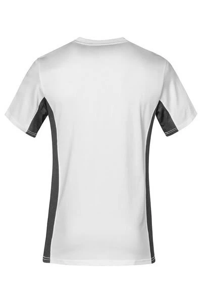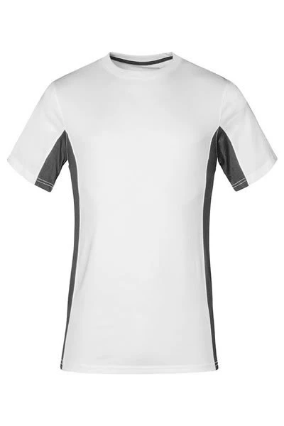 Das funktionelle Single-Jersey-T-Shirt besteht aus einem Mischgewebe mit einem Seitenteil in Kontrastfarbe. Das T-Shirt ist hautsympathisch und schnell trocknend, es besteht innen aus gekämmter Baumwolle und außen aus Polyester. Das T-Shirt hat einen Unisex-Schnitt und Seitennähte.