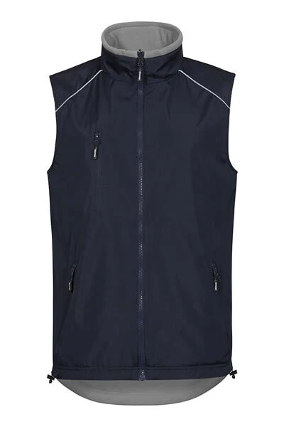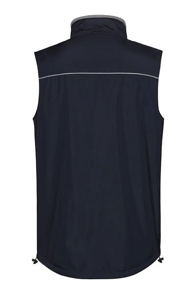 Die doppelseitige Weste mit Napoleontasche auf der Vorderseite verfügt über zwei Seitentaschen mit Reißverschluss. Die Weste verfügt über einen eingenähten Schlüsselring in der Seitentasche, reflektierende Paspeln und Reißverschlussschieber. Die Weste ist mit einem Tunnelzug am Saum mit Stiel, einem geschwungenen Saum und einem unsichtbaren Reißverschluss zur Dekoration ausgestattet. Es hat einen modernen Schnitt.
