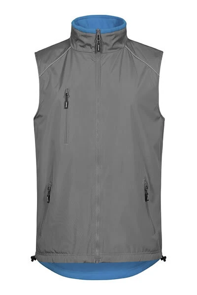 Die doppelseitige Weste mit Napoleontasche auf der Vorderseite verfügt über zwei Seitentaschen mit Reißverschluss. Die Weste verfügt über einen eingenähten Schlüsselring in der Seitentasche, reflektierende Paspeln und Reißverschlussschieber. Die Weste ist mit einem Tunnelzug am Saum mit Stiel, einem geschwungenen Saum und einem unsichtbaren Reißverschluss zur Dekoration ausgestattet. Es hat einen modernen Schnitt.