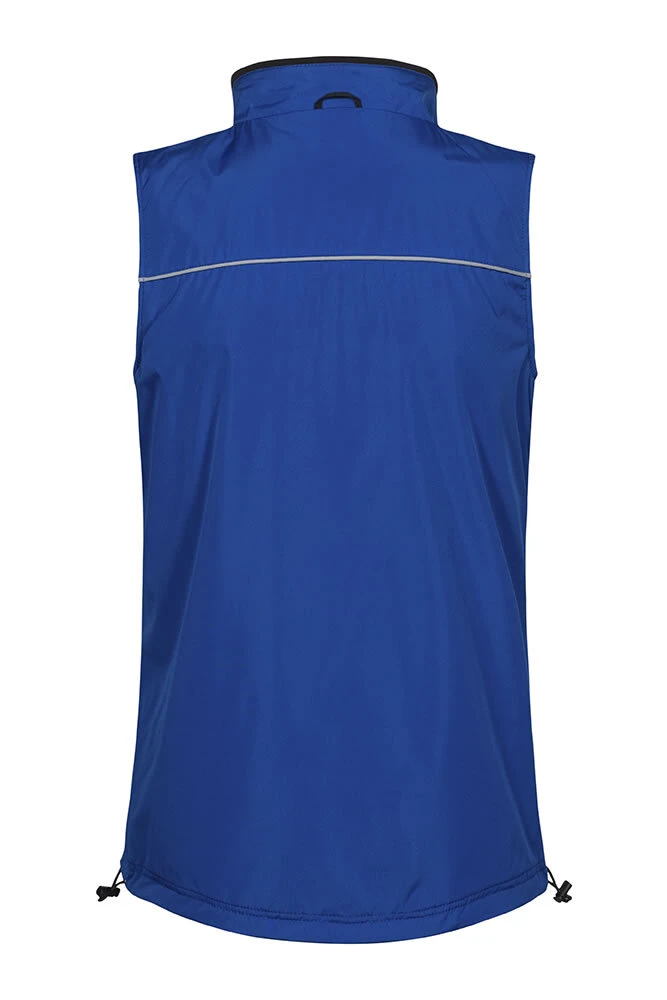 Die Wendeweste verfügt über einen Stehkragen, eine Napoleontasche vorne, zwei Seitentaschen mit Reißverschluss vorne/innen, einen eingenähten Schlüsselring in der Seitentasche, reflektierende Paspeln und Reißverschlussschieber. Die Weste hat einen Tunnelzug am Saum mit Stiel, einen abgerundeten Saum, einen unsichtbaren Reißverschluss zur Dekoration und einen modernen Schnitt.