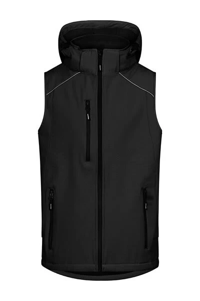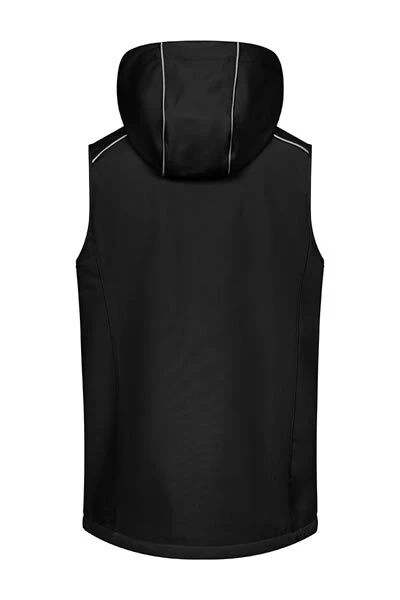 Funktionsweste mit abnehmbarer Kapuze mit Lautstärkeregler, wasserabweisenden Reißverschlüssen, Kinnschutz, Napoleontasche, Tunnelzug am Saum mit innenliegenden Kordelzugstoppern, längerem Rücken mit abgerundetem Saum, zwei seitlichen Reißverschlusstaschen, eingenähtem Schlüsselring in der Seitentasche, reflektierenden Paspeln und Reißverschluss Abzieher, getäfelte Nähte, neutrales Größenetikett. Das Material der Weste ist atmungsaktiv, wasserdicht (8.000 mm). Die Weste hat einen modernen Schnitt.
