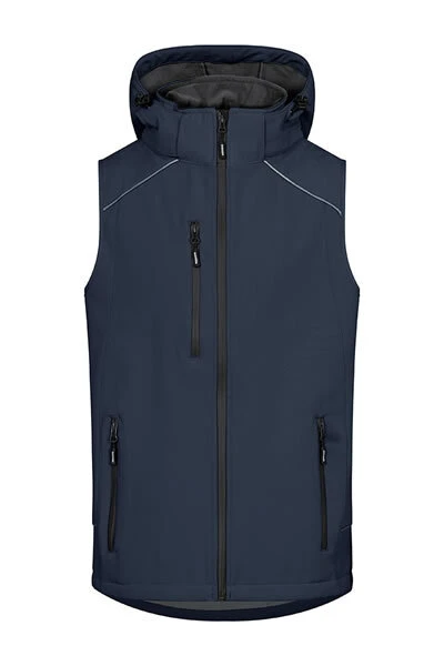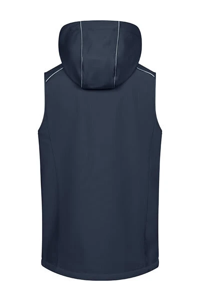 Funktionsweste mit abnehmbarer Kapuze mit Lautstärkeregler, wasserabweisenden Reißverschlüssen, Kinnschutz, Napoleontasche, Tunnelzug am Saum mit innenliegenden Kordelzugstoppern, längerem Rücken mit abgerundetem Saum, zwei seitlichen Reißverschlusstaschen, eingenähtem Schlüsselring in der Seitentasche, reflektierenden Paspeln und Reißverschluss Abzieher, getäfelte Nähte, neutrales Größenetikett. Das Material der Weste ist atmungsaktiv, wasserdicht (8.000 mm). Die Weste hat einen modernen Schnitt.