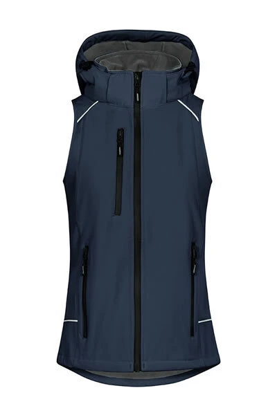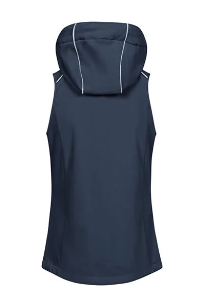 Funktionsweste mit abnehmbarer Kapuze und Lautstärkeregler, wasserdichten Reißverschlüssen, Kinnschutz, Napoleontasche, Tunnelzug am Saum mit innenliegenden Kordelzugstoppern, zwei Seitentaschen mit Reißverschluss und eingenähtem Schlüsselring in der Seitentasche. Die Weste hat reflektierende Besätze und Reißverschlussschieber. Das Material der Weste ist atmungsaktiv und wasserdicht (8.000 mm). Die Weste hat einen modernen Schnitt.