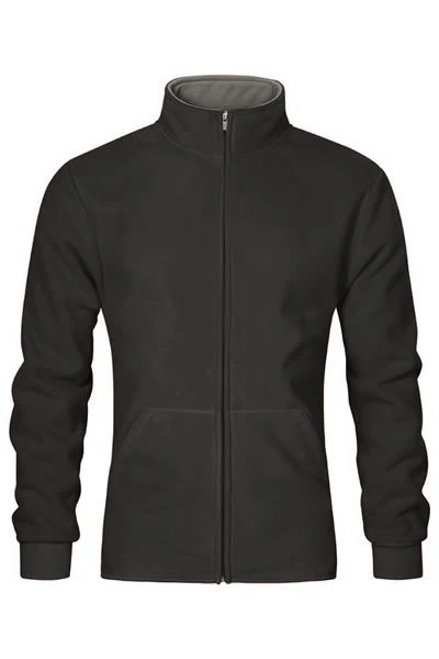 Die Doppelfleecejacke verfügt über einen Stehkragen und einen durchgehenden verdeckten Reißverschluss, sowie schmale Ärmelbündchen mit elastischem Besatz und zwei seitliche Reißverschlusstaschen. Die Innenseite der Jacke ist in einer Kontrastfarbe gehalten und besteht aus Polyester mit beidseitiger Antipilling-Behandlung. Die Fleecejacke ist schmal geschnitten.