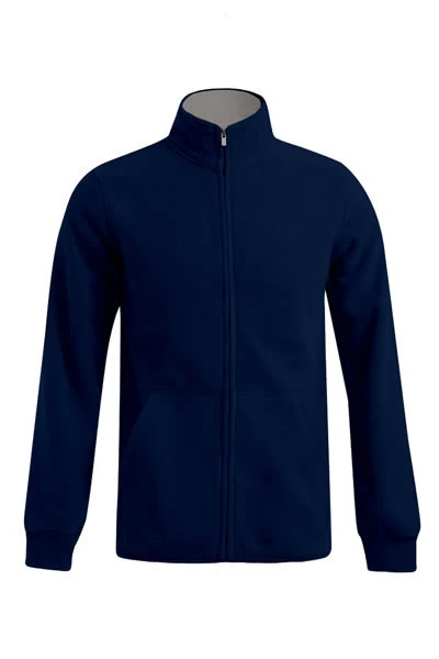 Die Doppelfleecejacke verfügt über einen Stehkragen und einen durchgehenden verdeckten Reißverschluss, sowie schmale Ärmelbündchen mit elastischem Besatz und zwei seitliche Reißverschlusstaschen. Die Innenseite der Jacke ist in einer Kontrastfarbe gehalten und besteht aus Polyester mit beidseitiger Antipilling-Behandlung. Die Fleecejacke ist schmal geschnitten.