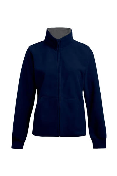 Die Doppelfleecejacke mit Stehkragen und durchgehendem Reißverschluss ist abgestimmt auf Elasthan-Ärmelbündchen und fühlbare Taschen mit Ziernähten. Die Innenseite der Jacke ist in einer Kontrastfarbe gehalten und sie besteht aus Polyester mit