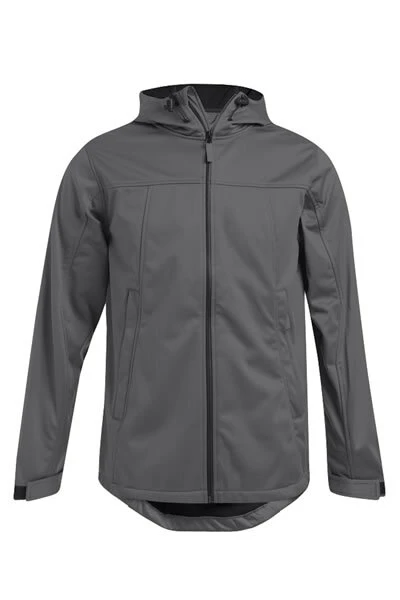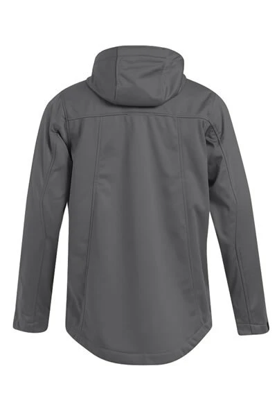 Die Softshelljacke mit klassischer Passform verfügt über einen wasserdichten Reißverschluss, Kinnschutz, volumenregulierende Kapuze mit elastischem Tunnelzugkordel und beidseitige Stopper. Die Jacke hat verstellbare Ärmelbündchen