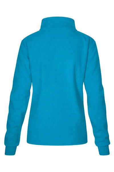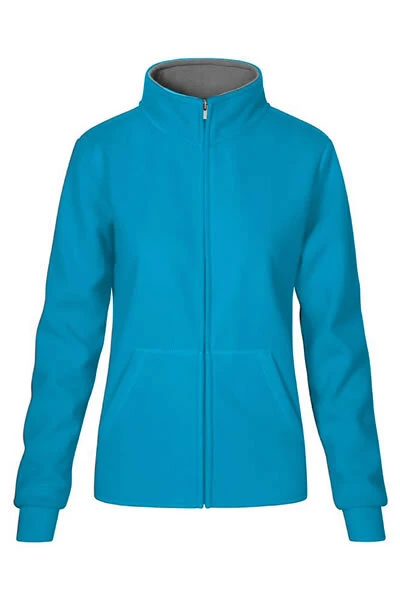 Die Doppelfleecejacke mit Stehkragen und durchgehendem Reißverschluss ist abgestimmt auf Elasthan-Ärmelbündchen und fühlbare Taschen mit Ziernähten. Die Innenseite der Jacke ist in einer Kontrastfarbe gehalten und sie besteht aus Polyester mit
