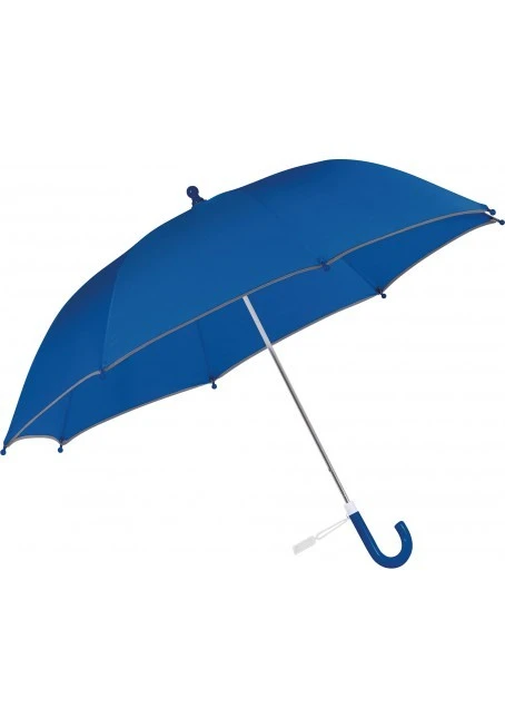 19"-Kinderregenschirm (48,5 cm), Bezug aus 190T Polyester-Pongé, manuell öffnend mit Windproof-System und Sicherheitsschieber, 8 mm Metallstock, Glasfaserstreben, gesicherte Strebenspitzen, abgerundeter Griff mit Identifikationsetikett. Mit Reflektorstreifen für mehr Sicherheit. Ø 85 cm