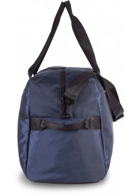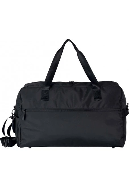 Reisetasche aus 900D-Polyester. Gurtgriffe, Schultergurt und Metall-Accessoires. 1 Reißverschlusstasche vorne zur leichteren Veredelung, 1 seitliche Tasche mit Druckknopf, 1 seitlicher Griff, Innenfutter aus Polyester mit Reißverschlusstasche. Fester Taschenboden aus Kunstleder mit Kunststofffüßen zum Schutz der Tasche.