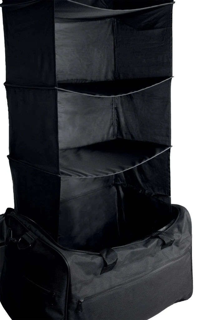 Reisetasche aus 600D-Polyester mit integrierten Regalfächern, die mit 2 Haken aufgehängt werden kann. 4 Fächer, darunter ein großes Fach unten, ideal für Schmutzwäsche. 2 seitliche Reißverschlusstaschen, 1 große Reißverschlusstasche vorne zur einfacheren Veredelung. Abnehmbarer, verstellbarer Schulterriemen.
