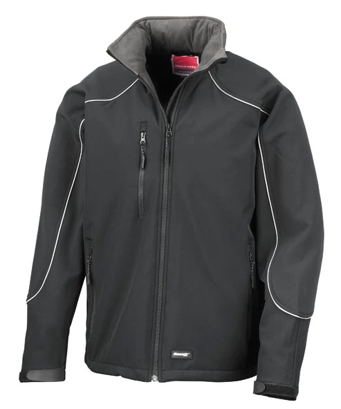 345 g/qm • Außen: 93% Polyester, 7% Elasthan • Mittelschicht: atmungsaktive TPU-Membran • Innen: 100% Polyester, Microfleece • Wind- und wasserfest • Verstellbare Kapuze im Kragen • Reflektierende Paspelierung auf Schultern und Ärmeln • Unterarm-Zip zur Belüftung • YKK-Full Zip mit windschutzblende innen • Diverse Innentaschen • Ärmelabschluss mit Klettverschluss • Taillenbund verstellbar durch elastischen Kordelzug mit Stoppern • Veredelungszugang auf linker Brustseite.