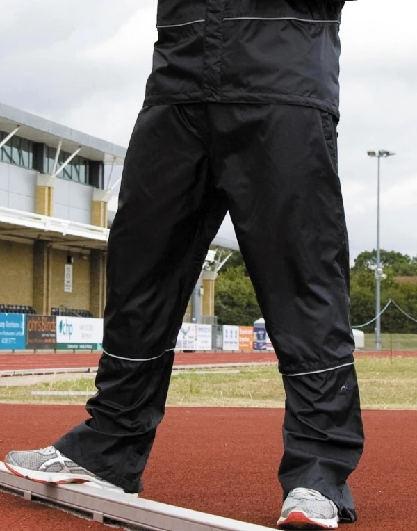 Außen: 100% Polyester (210T Ripstop) mit PU-Beschichtung • Futter: 100% Nylon • Wind- und wasserdicht (Versiegelte Nähte) • Elastischer Bund mit Kordelzug • Aufgesetzte Gesäßtasche mit Zip • Zip-Seitenschlitze zum Eingriff • Reflektierende Paspelierung im Wadenbereich • Zip vom Fußsaum bis zur Wade • Für Transferdruck geeignet.