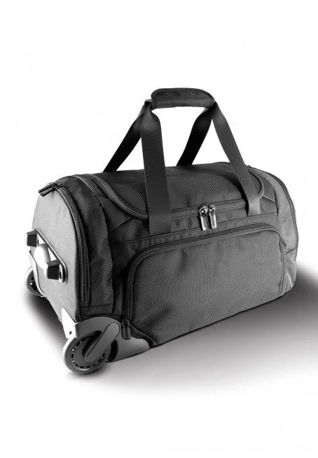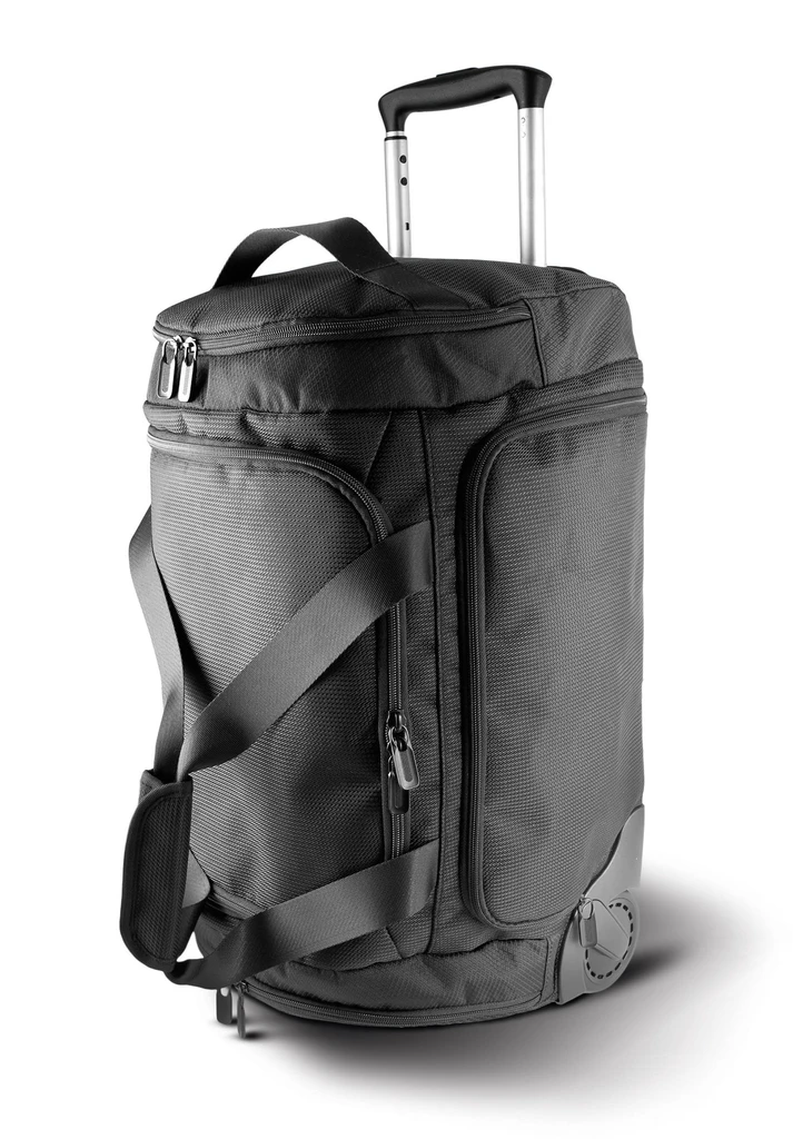 Große, elegante Trolley-Tasche aus 840D Polyester mit Jacquard-Muster. 1 Tasche vorne, 2 Taschen an der Seite, solides Rollen. Trolley-System, das sich in der Reißverschlußtasche auf der Oberseite verstauen läßt.