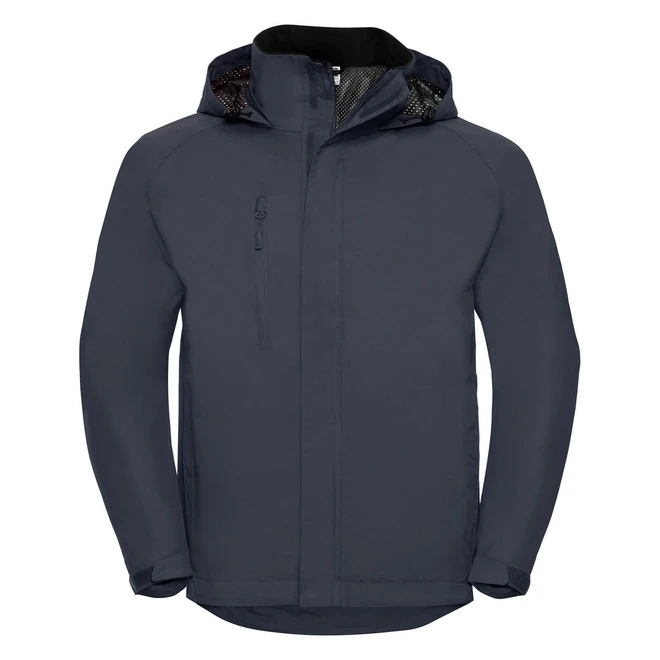 Verschweißte Nähte an kritischen Stellen, wasserdicht (2.000 mm), Atmungsaktiv (2.000 g/qm in 24 h), 3-teilige Kapuze im Kragen, Umgekehrt eingenähter Ton-in-Ton YKK-Zip mit Kinnschutz, Verdeckte Windschutzleiste mit Klettverschluss, Diverse Zip-Taschen, Verstellbare Ärmelbündchen, Verlängertes Rückenteil, Kordelzug mit Stoppern im Bund, Veredelungszugang im Bund. Zertifikate: STANDARD 100 by OEKO-TEX®; WRAP