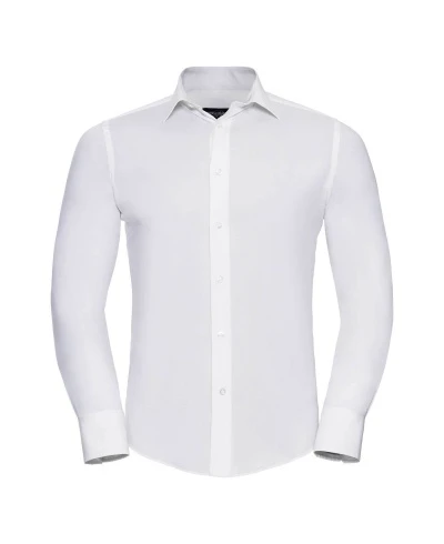Gewicht:140 g/m²; Material: 97% Baumwolle, 3% Elastan-Popeline; Körperbetontes Stretch Hemd – Langarm; Glattes Gewebe mit leichtem, Stretch, Halb ausgestellter 1-Knopf-Kragen, Ton-in-Ton Knöpfe, Rückwärtige Schulterpasse, Abgeschrägte doppelt geknöpfte Manschetten, dazu ein Knopf auf dem Manschettenaufschlag, Körperbetonter Schnitt, Abgerundeter Saum, Ersatzknöpfe, Pflegeleicht (Easy Care); Zertifikate: STANDARD 100 by OEKO-TEX®; WRAP