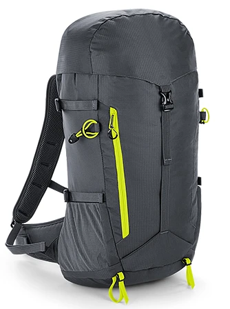 Tear-away Label für einfaches Neulabeln, Ultraleicht, aber sehr robust, Trinkblasenkompatibles Fach, EasyPanel™ leichter Zugriff auf die Stickfläche, Aufhängungsvorrichtung für Wanderstöcke, Wasserabweisend, Abnehmbarer, wasserdichter Regenschutz, Reflektierende Akzente, Einschubtasche innen, Karabinerhaken für Schlüssel o. ä., Elastische Netz-Seitentaschen, Leichter umfassender Rahmen, Flaches belüftetes Rückenteil, Gepolsterte, verstellbare Schulterriemen, Kompressionsriemen, Verstellbare Brust und Hüftgurte, Tragegriff; Maße: 30 x 62 x 22 cm; Fassungsvermögen: 35 Liter