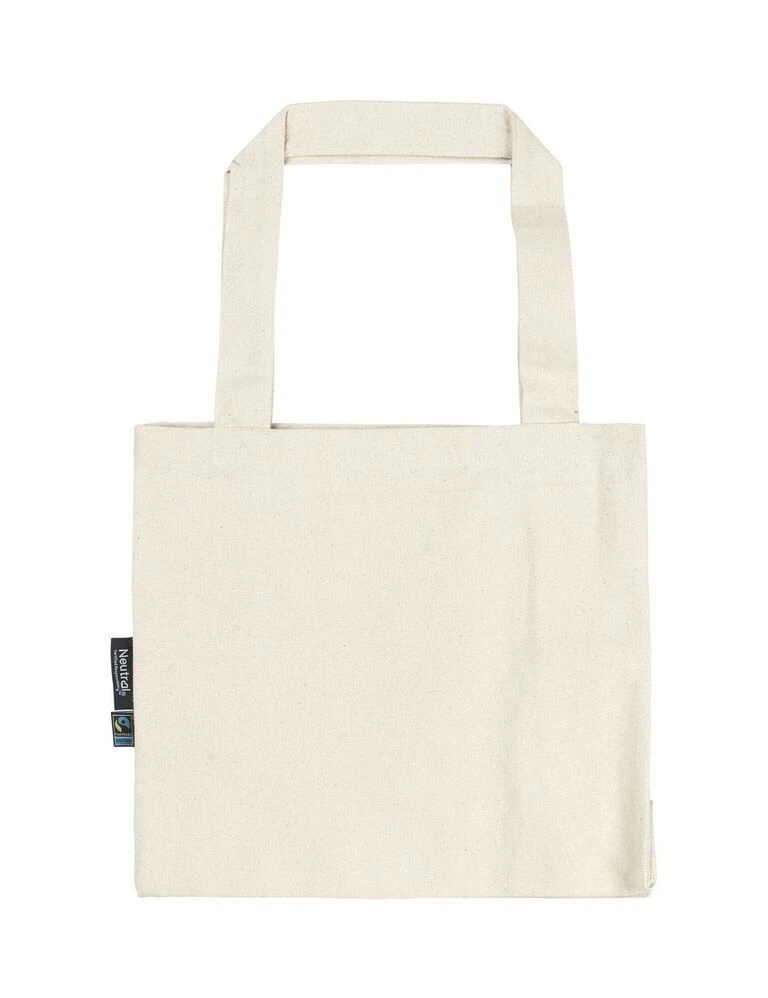 Material: 100% Bio-Fairtrade-Baumwolle, schweres Panama-Gewebe; Gewicht: 300 g/m²; Extra schweres Panama-Gewebe. Lange Griffe (50 cm). An Spannungspunkten verstärkt. Boden & Seitenzwickel. Größe: 28 x 26 cm. Neutral® & Fairtrade Flaglabels an der Seite; Zertifikate: OEKO-TEX® STANDARD 100, 100% CERTIFIED ORGANIC COTTON, FAIR WEAR, EU ECOLABEL, SA8000, NEUTRAL® RESPONSIBILITY