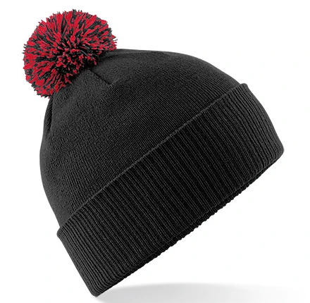 Tear-away Label für einfaches Neulabeln, Doppellagiger Strick, Zweifarbiger Pompon, Doppelfunktion - mit Umschlag als Mütze oder ohne Umschlag als Slouch-Beanie, Gerippter Umschlag