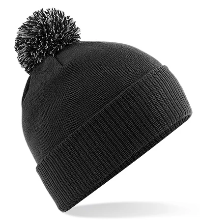 Tear-away Label für einfaches Neulabeln, Doppellagiger Strick, Zweifarbiger Pompon, Doppelfunktion - mit Umschlag als Mütze oder ohne Umschlag als Slouch-Beanie, Gerippter Umschlag