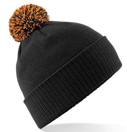 Tear-away Label für einfaches Neulabeln, Doppellagiger Strick, Zweifarbiger Pompon, Doppelfunktion - mit Umschlag als Mütze oder ohne Umschlag als Slouch-Beanie, Gerippter Umschlag
