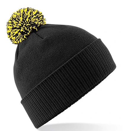 Tear-away Label für einfaches Neulabeln, Doppellagiger Strick, Zweifarbiger Pompon, Doppelfunktion - mit Umschlag als Mütze oder ohne Umschlag als Slouch-Beanie, Gerippter Umschlag