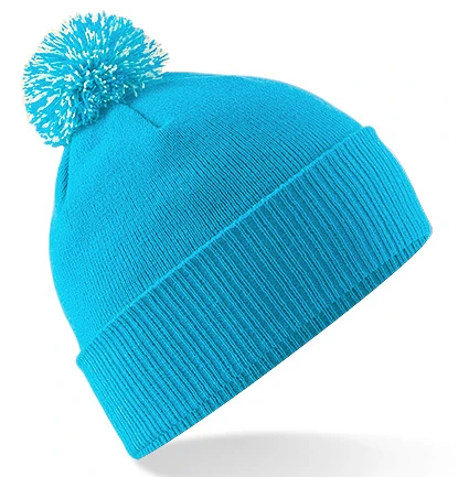 Tear-away Label für einfaches Neulabeln, Doppellagiger Strick, Zweifarbiger Pompon, Doppelfunktion - mit Umschlag als Mütze oder ohne Umschlag als Slouch-Beanie, Gerippter Umschlag