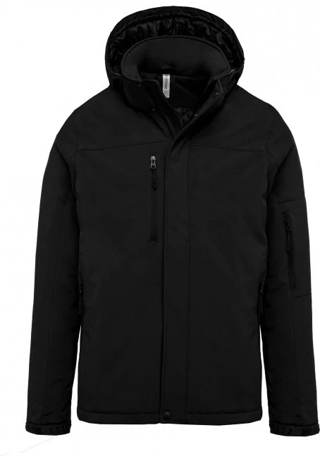 95 % Polyester / 5 % Elasthan. Dreilagiges Verbundgewebe atmungsaktiv 3.000 g/m²/24 h und wasserdicht 8.000 mm. Außenmaterial: 95 % Polyester / 5 % Elasthan. Atmungsaktive Mittelmembran. Innenschicht: Mikrofleece. Innenfutter gesteppt, 100 % Polyester. Vorderseite: 4 Reißverschlusstaschen (2 Seitentaschen, 1 am Ärmel, 1 an der rechten Brustseite). 2 Innentaschen mit Druckknopfverschluss. Abnehmbare Kapuze in 3-Bahnen-Design, gefüttert und gesteppt, Kordel mit Stoppern zum Zuziehen. Klettverschluss am Ärmel zur Weitenregulierung. 1 Reißverschluss an der Brusttasche links und 1 Reißverschluss am Saum zur Veredelung.