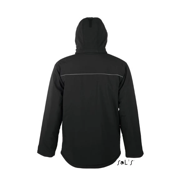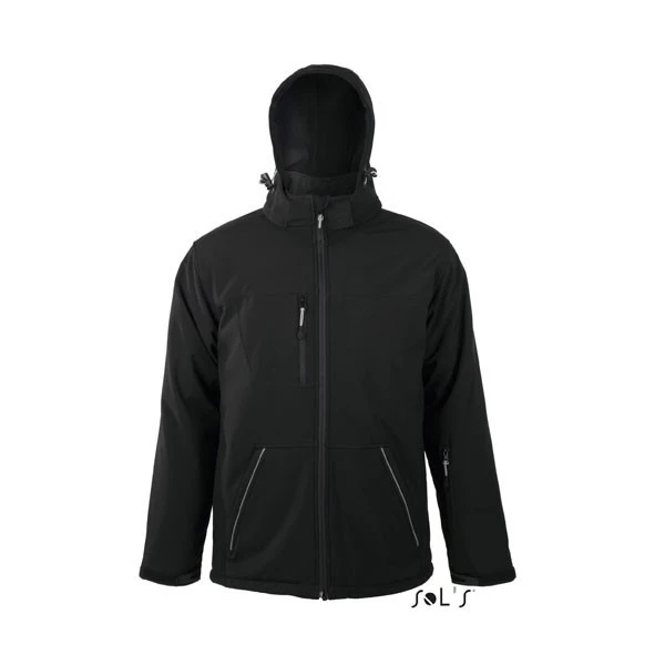 SOFT SHELL 340 - 3 Schichten, Außenschale: 94% Polyester - 6% Elasthan, 100% Polyester Taftfutter, 8000 mm wasserdichte und atmungsaktive Membran, 100% Polyester 160 g/m² Polsterung; Abnehmbare Kapuze mit Lidschatten, einstellbar durch 2 Kordeln, Stopper und selbstgreifendes Band, 3 Reißverschlusstaschen vorne, 1 Reißverschlusstasche, 1 Innentasche mit Reißverschluss und 1 Netztasche innen,Verstellbare Manschetten und innere Strectch-Manschetten mit selbstgreifendem Verschluss, elastischer Kordelzug unten