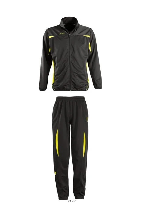Qualität: 100% glänzender Interlock-Polyester; Jacke - Abschluss an Taille und Ärmeln mit elastischem Schrägband, 2 Reißverschlusstaschen große, atmungsaktive Mesh-Einsätze an Seiten und Ärmeln, Ärmelabschluss mit elastischem Schrägband, branded Zipper Pull Logo & Marke kontrasterend gestickt, Hose elastischer Bund mit Zugkordel, kontrastierende, atmungsaktive Mesh-Einsätze, 2 Reißverschlusstaschen Logo und Marke kontrastierend gestickt
