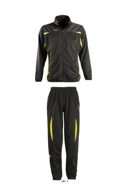Qualität: 100% glänzender Interlock-Polyester; Jacke - Abschluss an Taille und Ärmeln mit elastischem Schrägband, 2 Reißverschlusstaschen große, atmungsaktive Mesh-Einsätze an Seiten und Ärmeln, Ärmelabschluss mit elastischem Schrägband, branded Zipper Pull, Logo & Marke kontrasterend gestickt, Hose elastischer Bund mit Zugkordel, kontrastierende, atmungsaktive Mesh-Einsätze, 2 Reißverschlusstaschen Logo und Marke kontrastierend gestickt