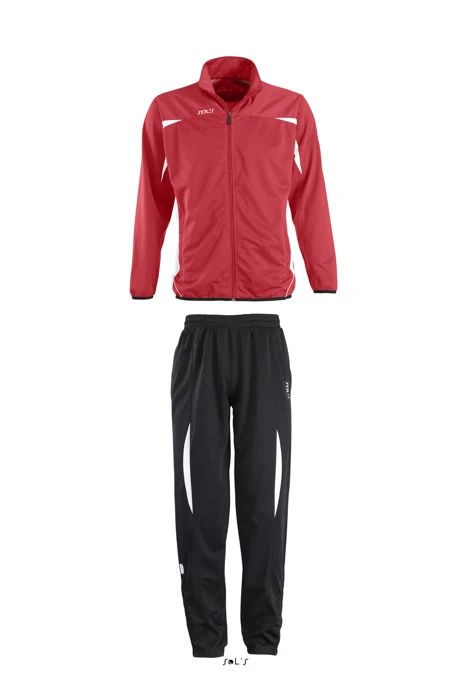 Qualität: 100% glänzender Interlock-Polyester; Jacke - Abschluss an Taille und Ärmeln mit elastischem Schrägband, 2 Reißverschlusstaschen große, atmungsaktive Mesh-Einsätze an Seiten und Ärmeln, Ärmelabschluss mit elastischem Schrägband, branded Zipper Pull, Logo & Marke kontrasterend gestickt, Hose elastischer Bund mit Zugkordel, kontrastierende, atmungsaktive Mesh-Einsätze, 2 Reißverschlusstaschen Logo und Marke kontrastierend gestickt
