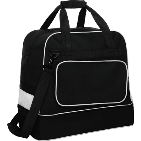 Sporttasche mit Tragegriffen und Schultergurt. Aufgesetzte Fronttasche mit Reißverschluss. Verstärktes Schuhfach, geschützt gegen Feuchtigkeit. Bodenstollen. Leicht zu reinigen.