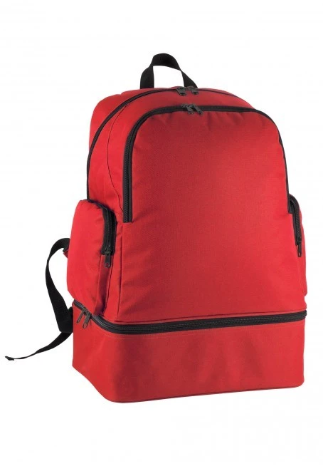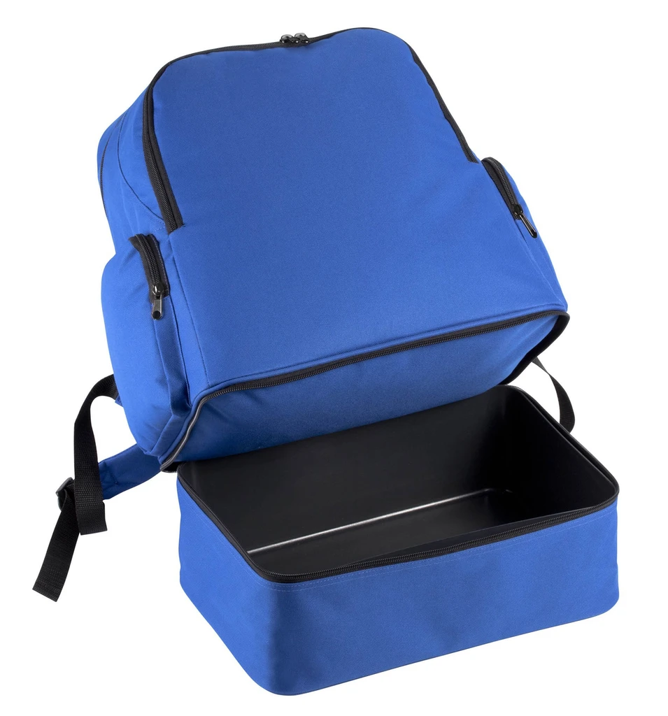 Sportrucksack aus 600D Polyester mit doppelter PVC-Beschichtung. Fester, abnehmbarer Boden aus PP mit Kunststoff-Standfüßen. Reißverschlusstasche vorne zur leichteren Veredelung, 2 Seitentaschen, Kartenhalter. Fester Boden im Lieferumfang enthalten.