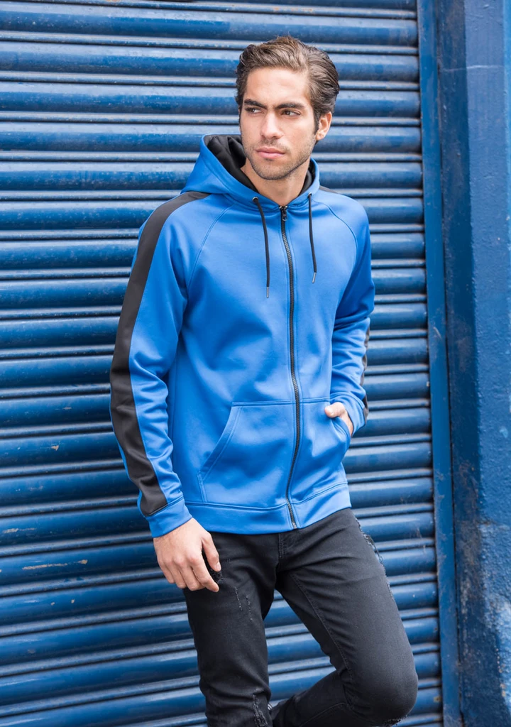 Split kangaroo pouch pocket with hidden opening for ear phone cord feed