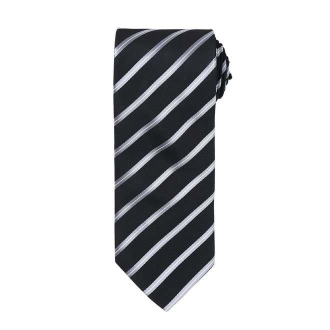 Eine klassische Sports Stripe Tie, getragen als traditionelles Teamwear-Team für diejenigen, die einen zusammenhängenden Look suchen. Schmale Streifen sind über die gesamte Länge der Krawatte eingewoben und sorgen für einen angenehmen Stil.